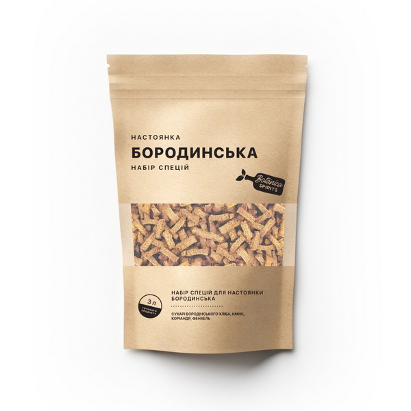 Напій названий за аналогією з ароматним бородинським хлібом, в який за рецептом додається багато коріандру. Крім прянощів, до бородинської настоянки обов'язково входять чорні сухарики з цього хліба. Такий напій ідеально підійде до будь-яких страв зі свинини, птиці, гуляшу, салатів – загалом, до всього пряного, смачного та апетитного.
